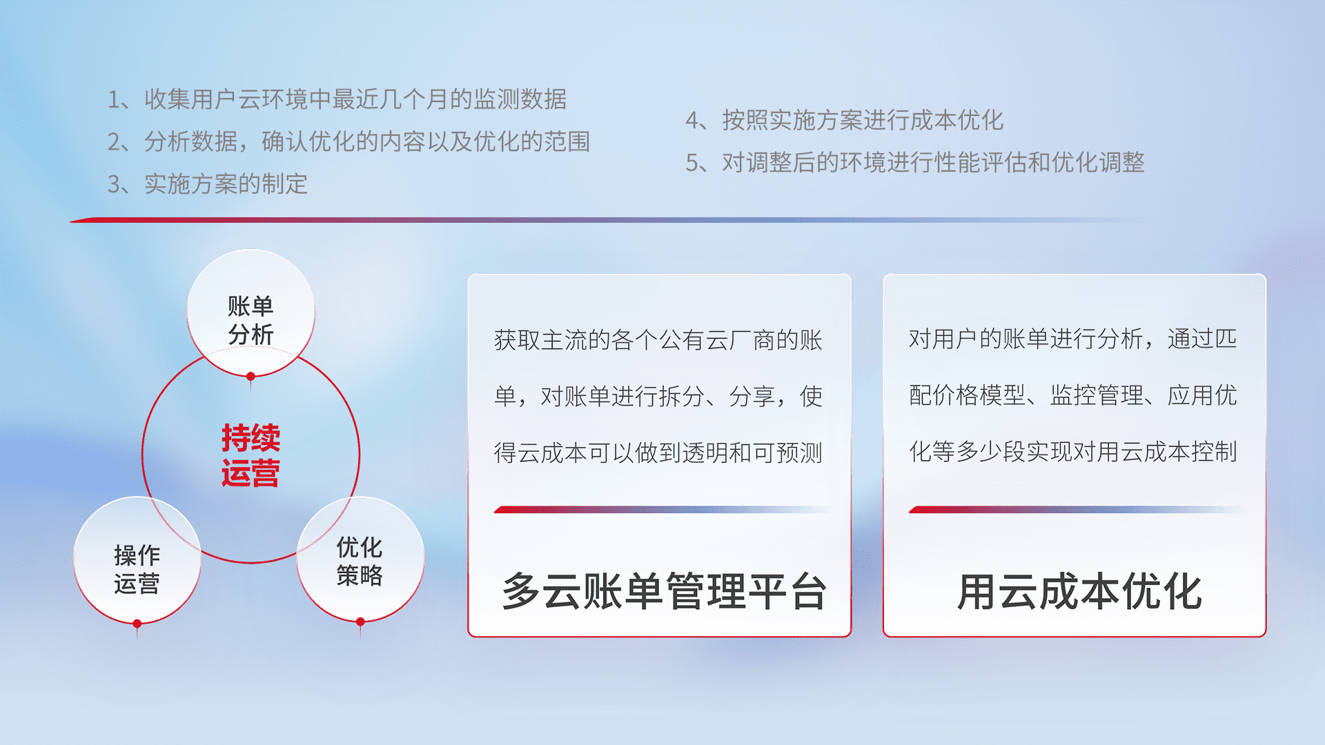 通过多云纳管,,,以统一的资源数据模型把客户的云资源进行抽象和封装,,,,进而实现对多云资源的统一操作,,,,保障云资源管理的可靠性、、、、稳定性与可用性。。。。量身定制化运维内容,,,配置、、、开发运维、、、补丁管理、、、备份、、、监控、、认证和访问管理、、审计和日常巡检等,,,保障在用云过程中的可靠度,,,,稳定度以及高可用率。。